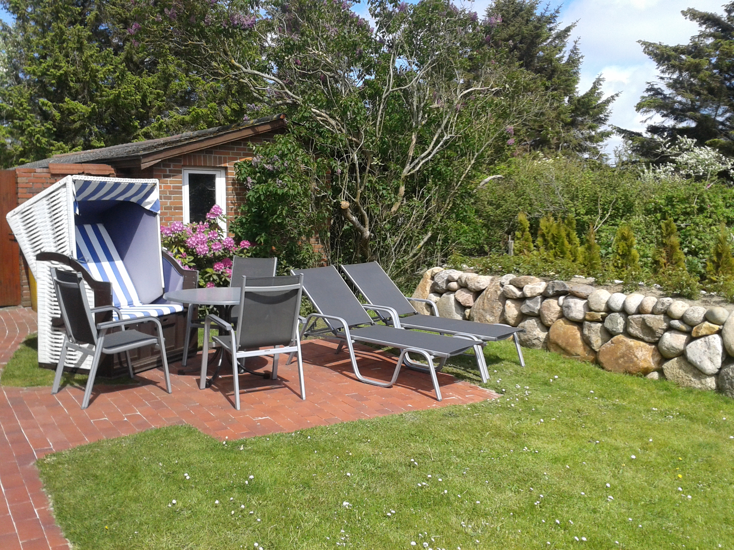 | Sitzgruppe mit Strandkorb und Liegen im Garten | Gartenbereich mit Liegen | ||||||||