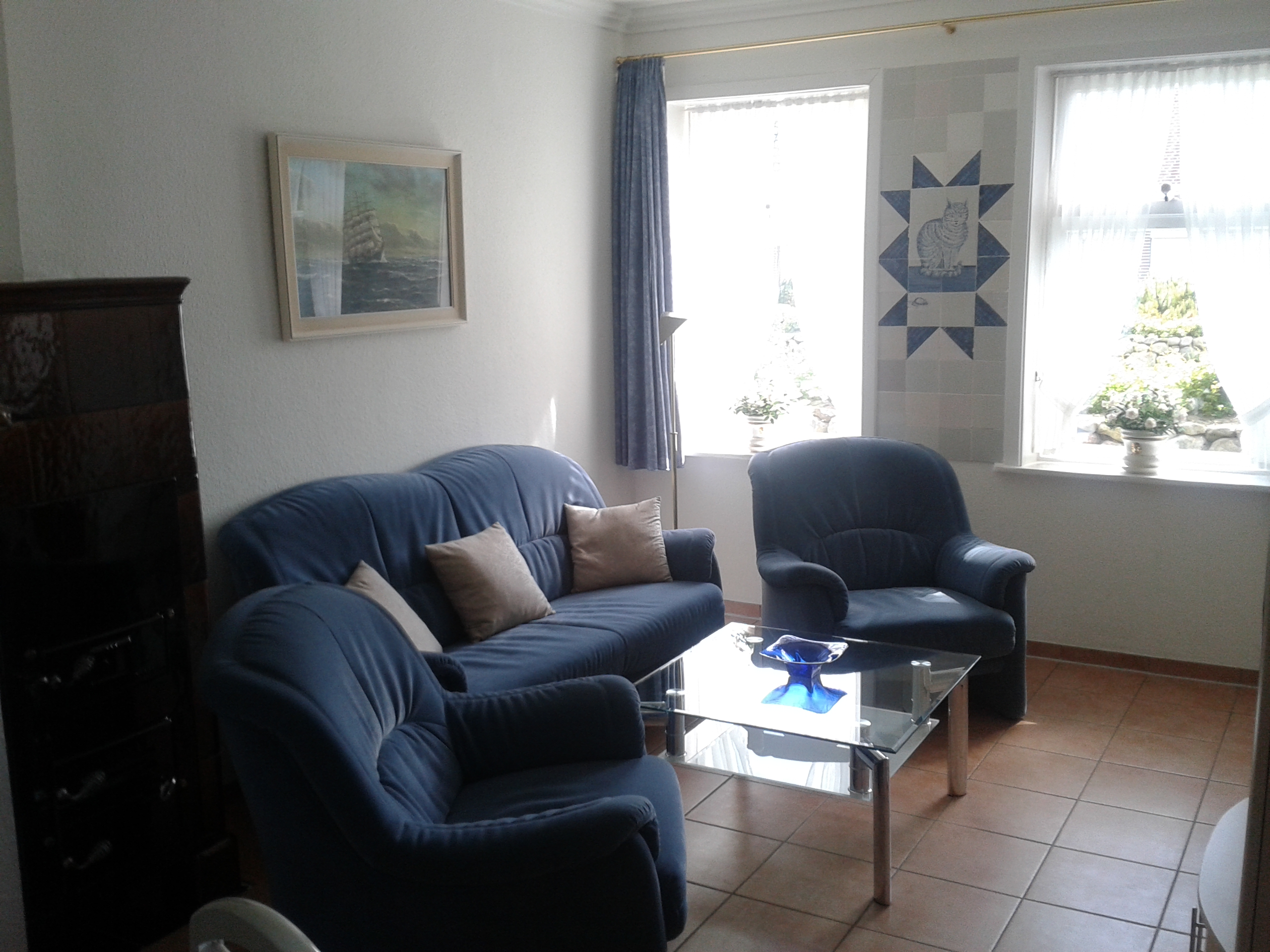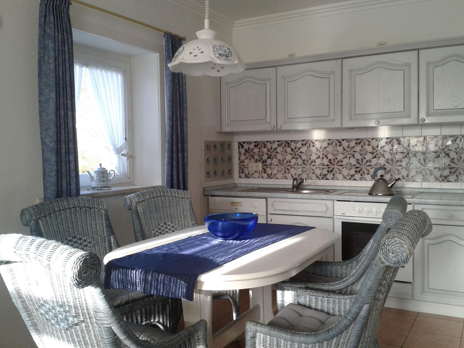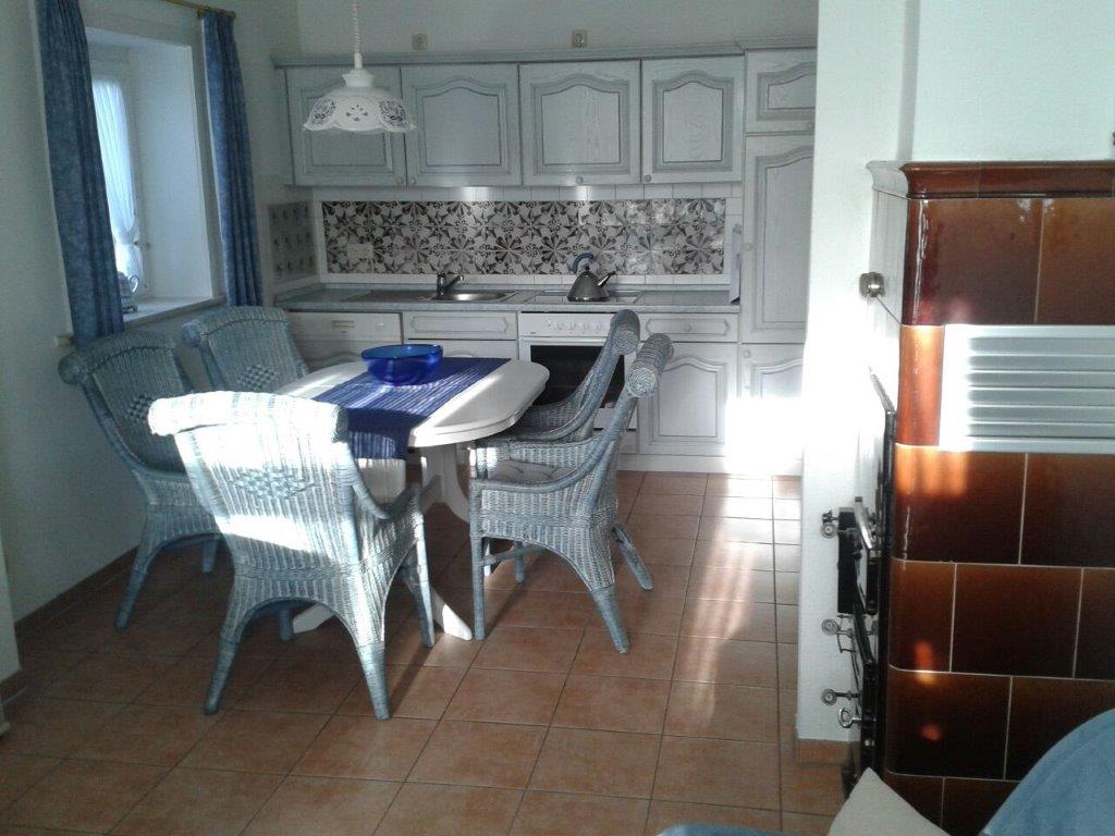 | Friesenküche, kompl. eingerichtet mit Geschirrspülautomat, Herd mit Cerankochfeld u. Backofen | Wohnzimmer mit Kachelofen, Fußbodenheizung, Fernseher | ||||||||